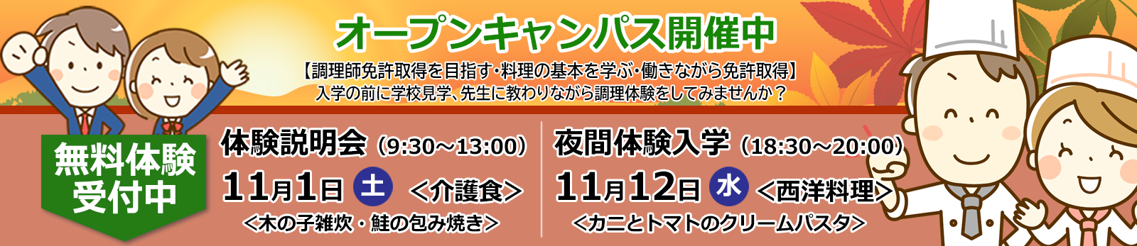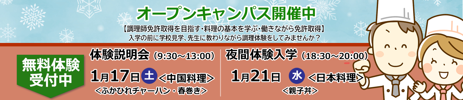 夜間に調理師免許が取得できるのは群馬県では本校のみ。働きながら調理師を目指してみませんか?調理師免許の取得や、料理技術向上のために通学するなど、その目的は様々。年齢層は幅広く、楽しい2年間となることでしょう。